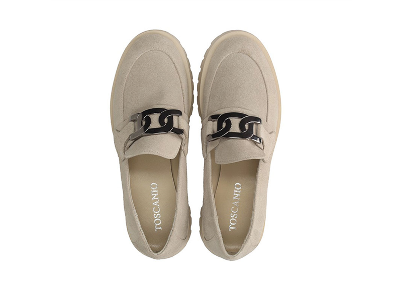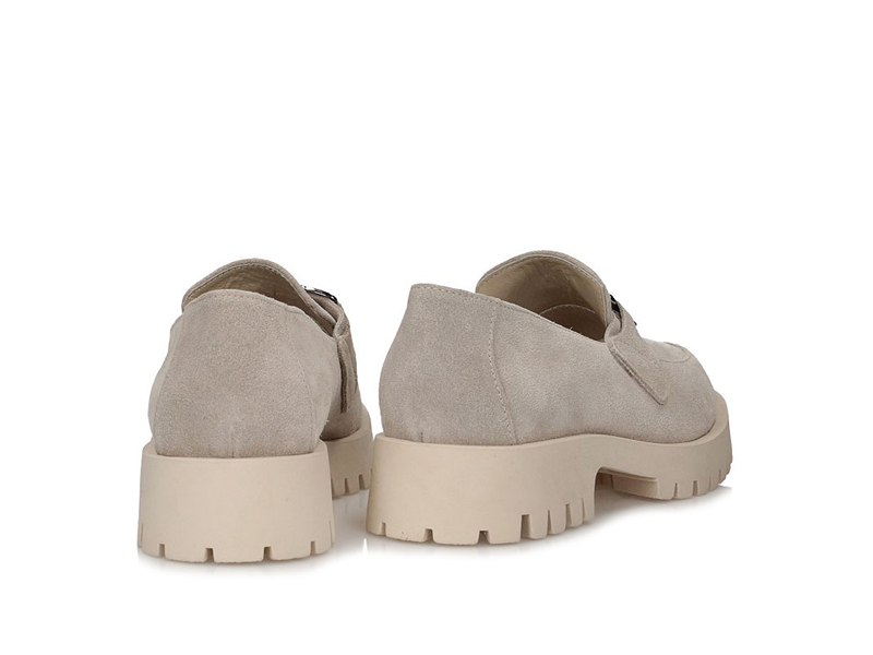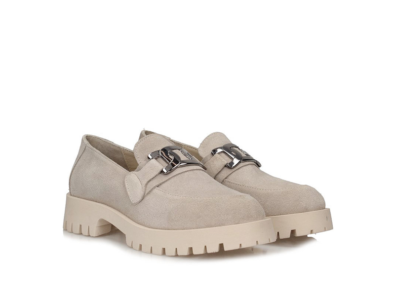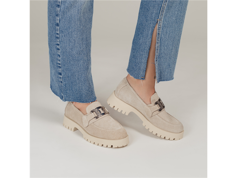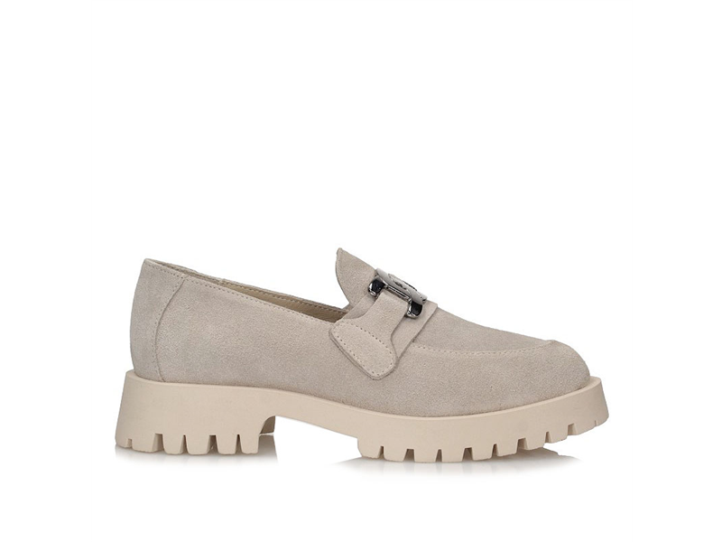 Mokasyny damskie z kategorii komfort, miękki welur naturalny , lekka wydodna podeszwa, migdałkowy nosek. W kontraście do klasycznej formy cholewki zastosowana modernistyczną podeszwę, na podbiciu srebrna ozdoba.