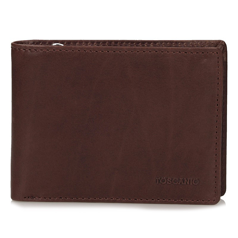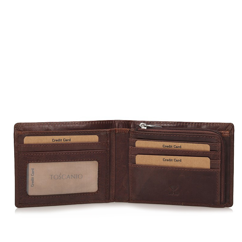 Portfel wykonany z naturalnej, włoskiej skóry, wyposażony w przegródki na karty, banknoty oraz
